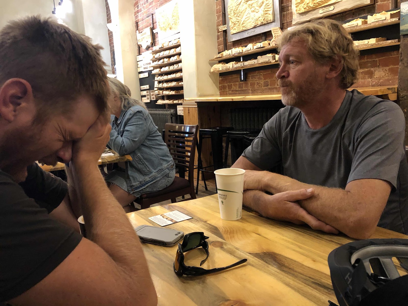 We wake amidst the disaster of our slightly less damp gear and shuffled down the hall for a good old hotel breakfast. Peter promises to eat two waffles and actually pulls it off while Steve and I eat twice as much as most everyone else. With breakfast accomplished we pack up and head up the hill to town only to find that the bike store Cycles of Life doesn’t open till 10. Not big deal, we hit up the local coffee shop and easily pass the time. As 10 rolls around we are at the bike shop, eager to get my bike booked in. The shop is AMAZING, not only do they make my bike a priority they also sell me a new front break at a truly awesome price. Just over 2 hours and $100 later we are in our way (but not before pizza with our trail friend from the second day).